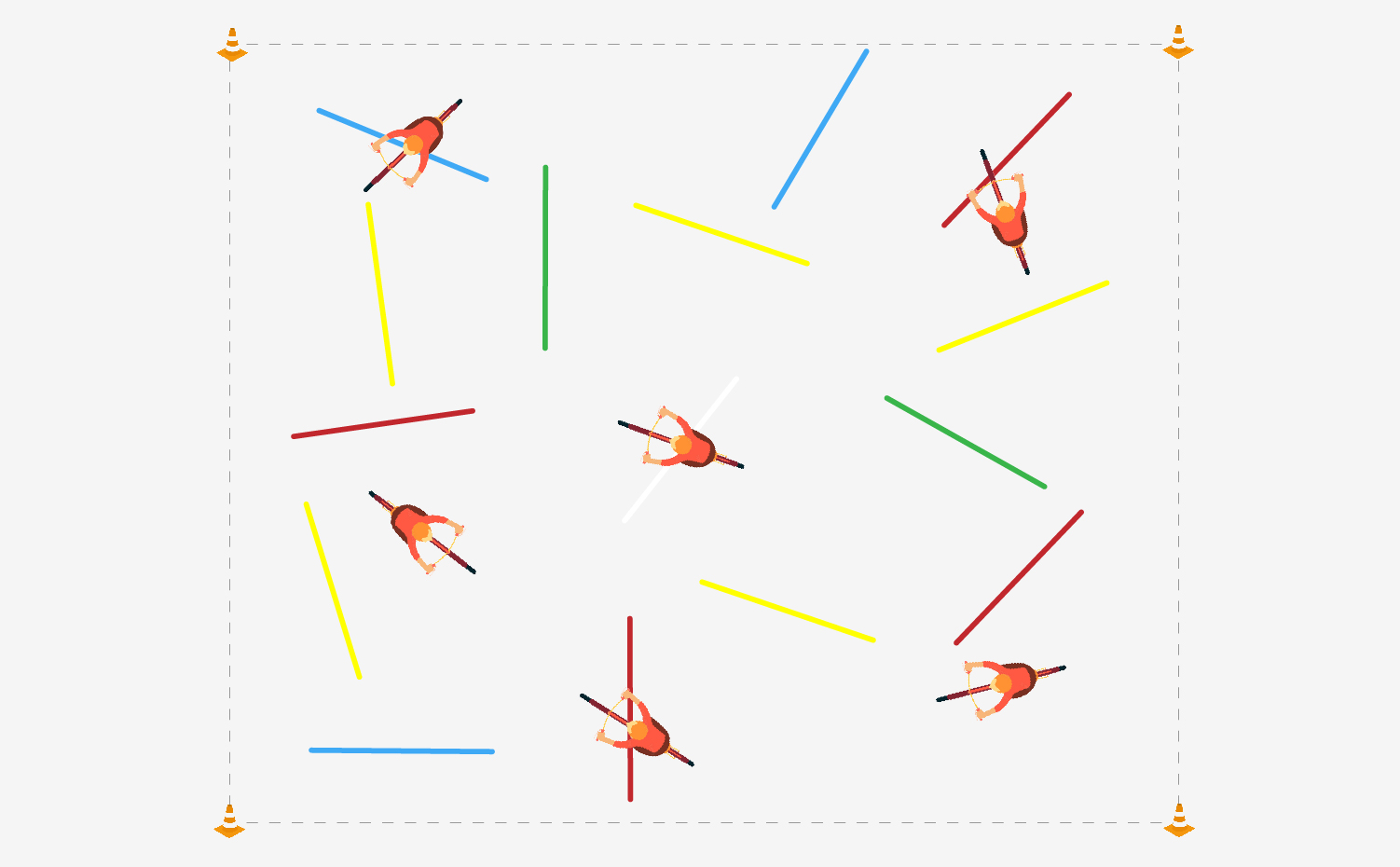 Zet een vierkant uit van ongeveer 10 x 10 meter. Gebruik pylonen om het vierkant af te bakenen. Maak strepen van 150 cm in 5 verschillende kleuren in het vierkant. Elke kleur heeft een eigen aantal strepen. Verdeel de kleurstrepen zo goed mogelijk over het vierkant.